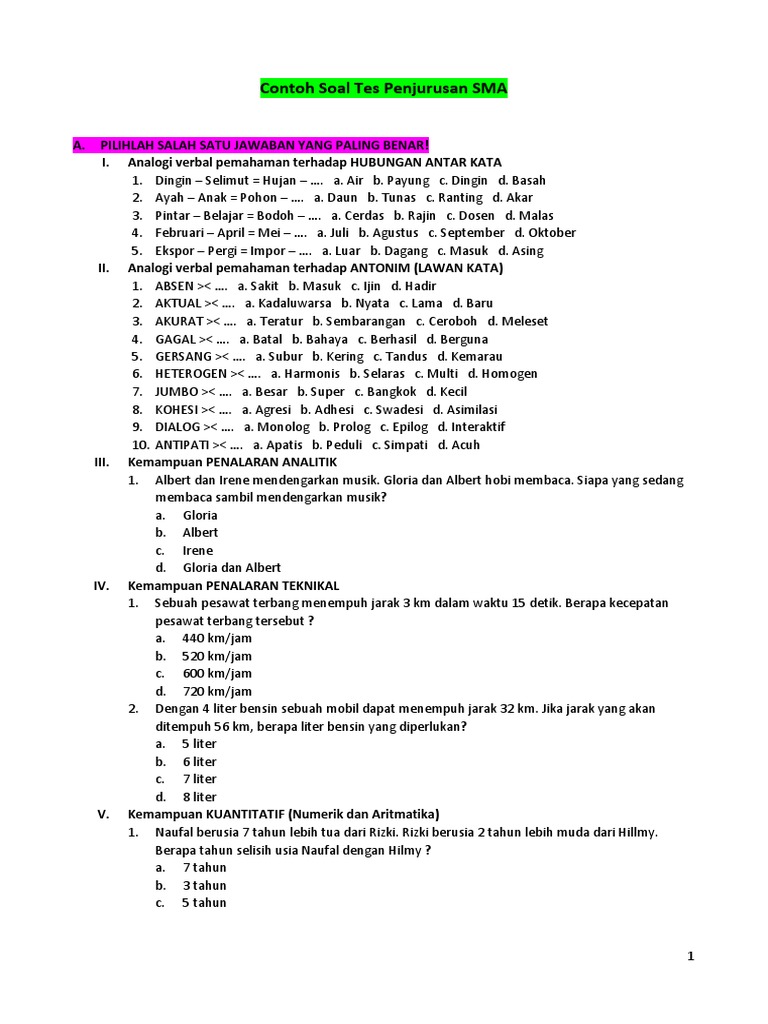 / Contoh Soal Tes Peminatan Jurusan Sma / Soal Latihan Tes Masuk Sma Smk Dan Tes Penjurusan Atau Peminatan Psb Ipa Ok : Soal tes masuk sma 2021 dan pembahasannya, dijamin lolos!
