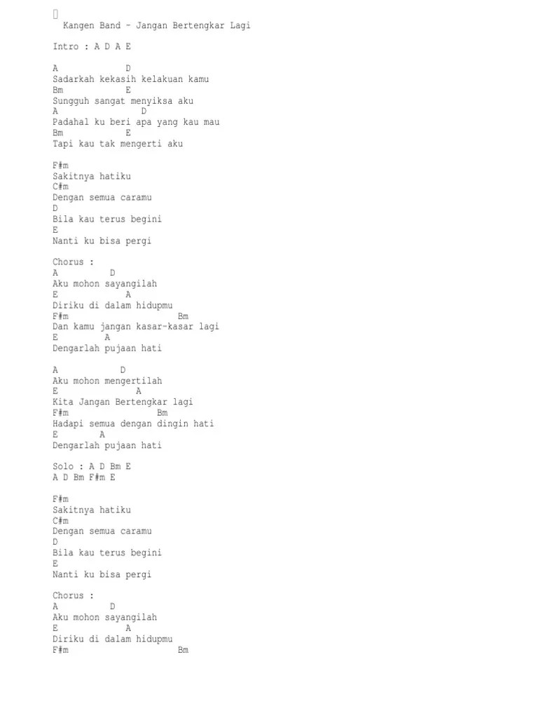intro a d a e a d sadarkah kekasih kelakuan kamu bm e sungguh sangat menyiksa aku a d padahal ku beri apa yang kau mau bm e tapi kau tak mengerti aku f#m sakitnya hatiku c#m dengan semua caramu d bila kau terus begini e nanti ku bisa pergi chorus a d aku mohon sayangilah.